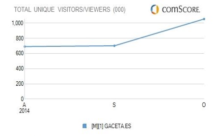 El digital del Grupo Intereconomía Gaceta.es tuvo un crecimiento en visitas del 45% entre septiembre y octubre, hasta alcanzar las 3.103.000. Asimismo, recibió un 50% más de usuarios únicos al superar el millón de visitantes y alcanzó las 6 millones de páginas vistas, según comScore.