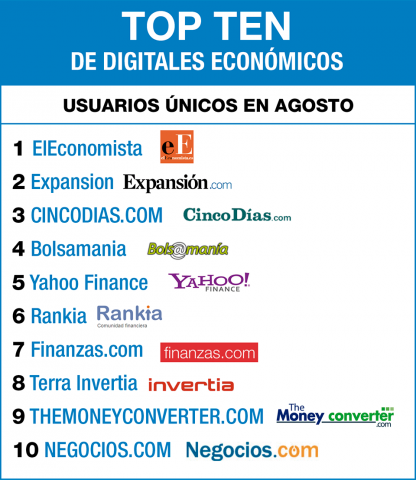 6-10-2014. Negocios.com entra en el top ten de los digitales económicos con más tráfico de España. Y es que recibió en agosto 263.000 usuarios únicos (+61% respecto a julio), 781.000 visitas (+12%) y 2 millones de páginas vistas.
